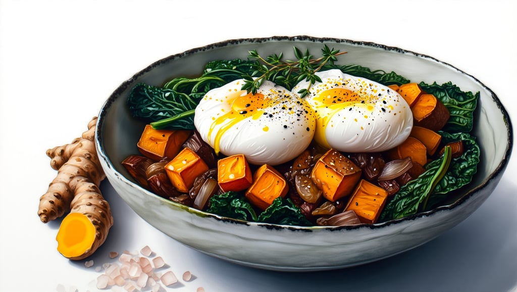 A vibrant anti-inflammatory breakfast featuring roasted sweet potatoes, kale, turmeric, and poached eggs. This golden hash delivers a symphony of antioxidants, omega-3s, and phytonutrients designed to soothe inflammation and nourish from the inside out.