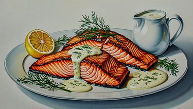 Serve on a warmed white plate with the sauce spooned in a crescent moon shape beside the salmon. Garnish with an extra sprig of dill and a thin slice of lemon. For sides, consider sautéed spinach in olive oil, roasted asparagus, or cauliflower mash.