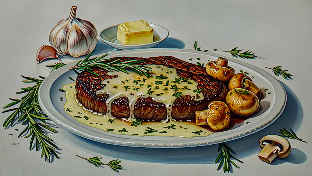 Finish with garlic butter: Place the rested steaks on plates, top each with a generous dollop of garlic rosemary butter, and spoon the mushrooms alongside. The butter will melt luxuriously into the steak’s surface.