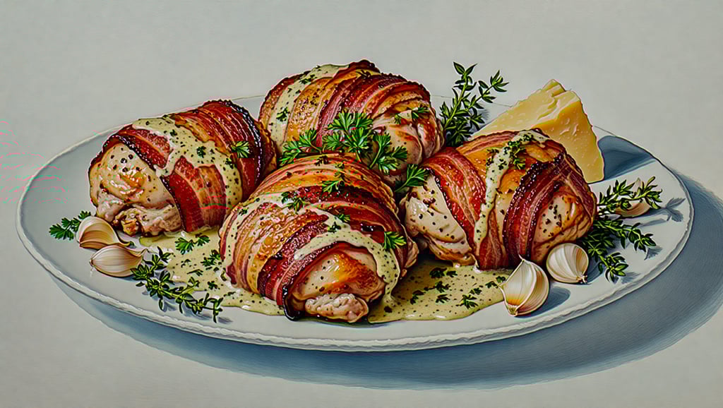 Plate: Spoon garlic cream sauce onto plates, place bacon-wrapped chicken thighs on top, and garnish with parsley.