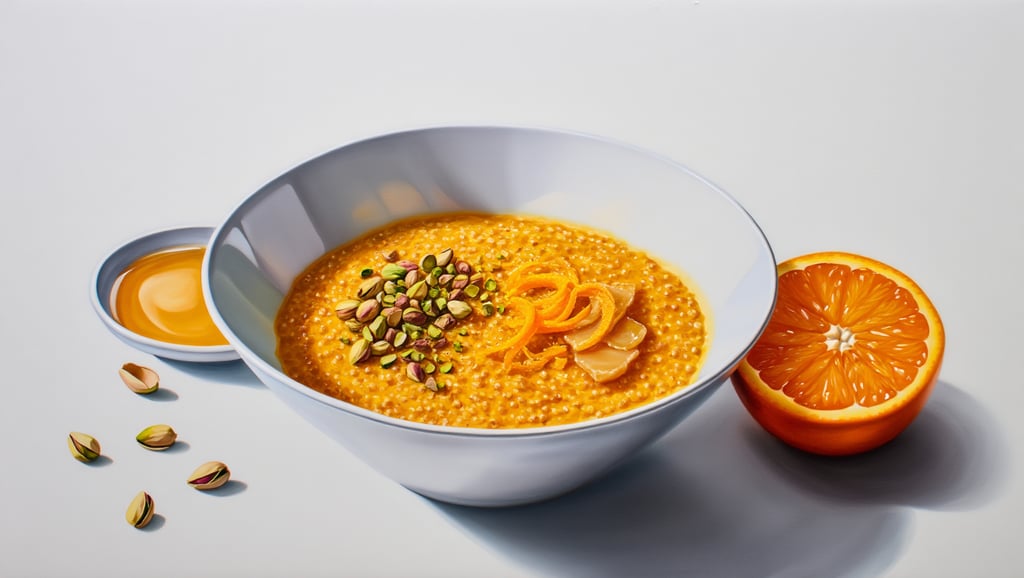 Serve in bowls, topping with orange segments, zest, pistachios, and a few slices of ginger. Drizzle lightly with honey or almond milk for sheen and contrast.